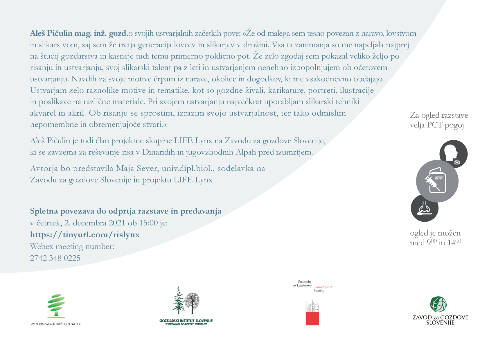 Ob odprtju razstave bo Aleš Pičulin, ki je tudi član projektne skupine LIFE Lynx na Zavodu za gozdove Slovenije, predstavil kako poteka reševanje risa v Dinaridih in JV Alpah pred izumrtjem.