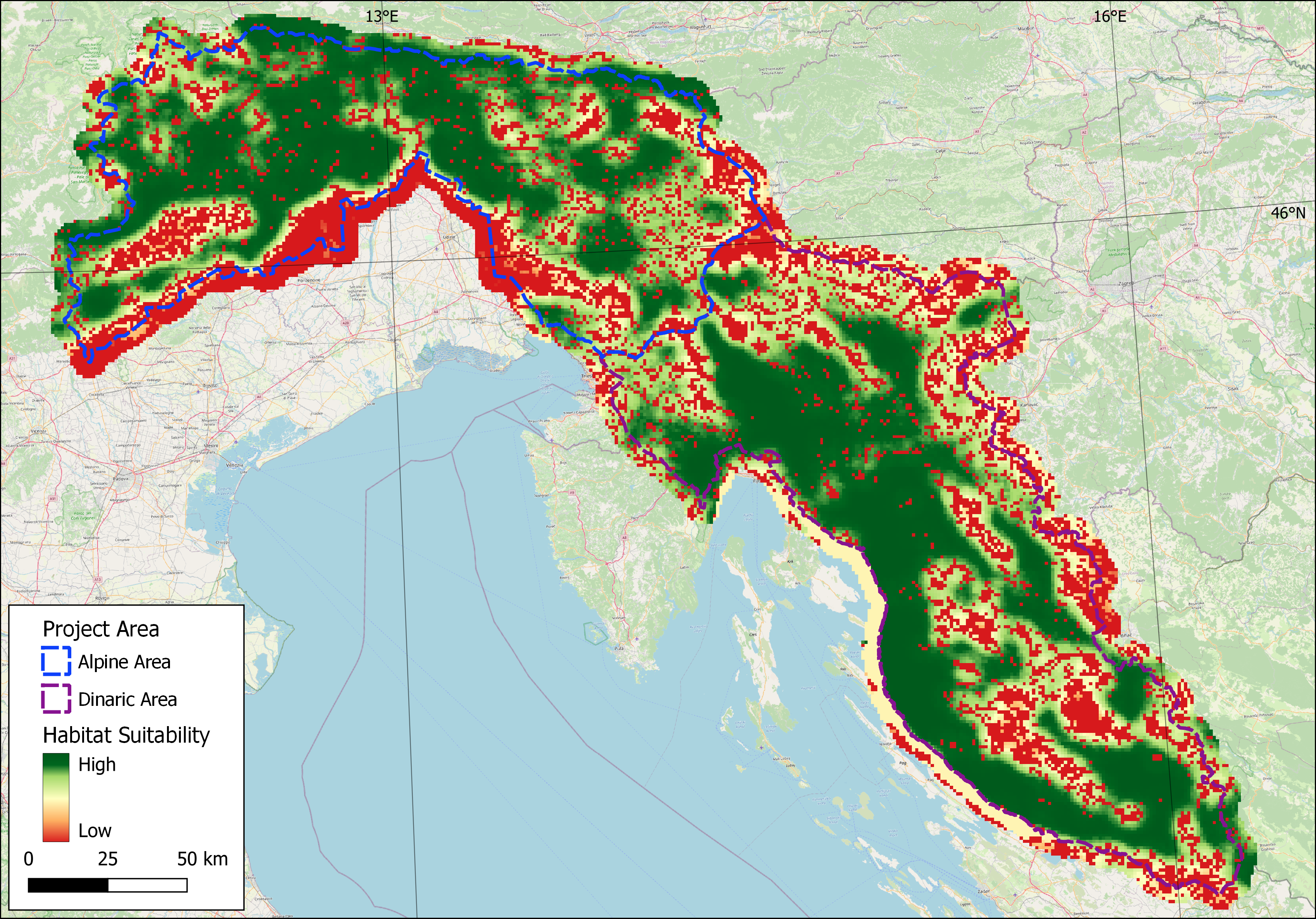 Mappa di idoneità dell’habitat basata su Maxent. Le sfumature verdi indicano un habitat idoneo mentre le sfumature rosse indicano un habitat meno favorevole e inadatto. La previsione del modello rende i complessi forestali dei Monti Dinarici un habitat altamente adatto per la lince, mentre l’habitat adatto nelle Alpi è scarso e per lo più limitato agli altopiani boscosi.