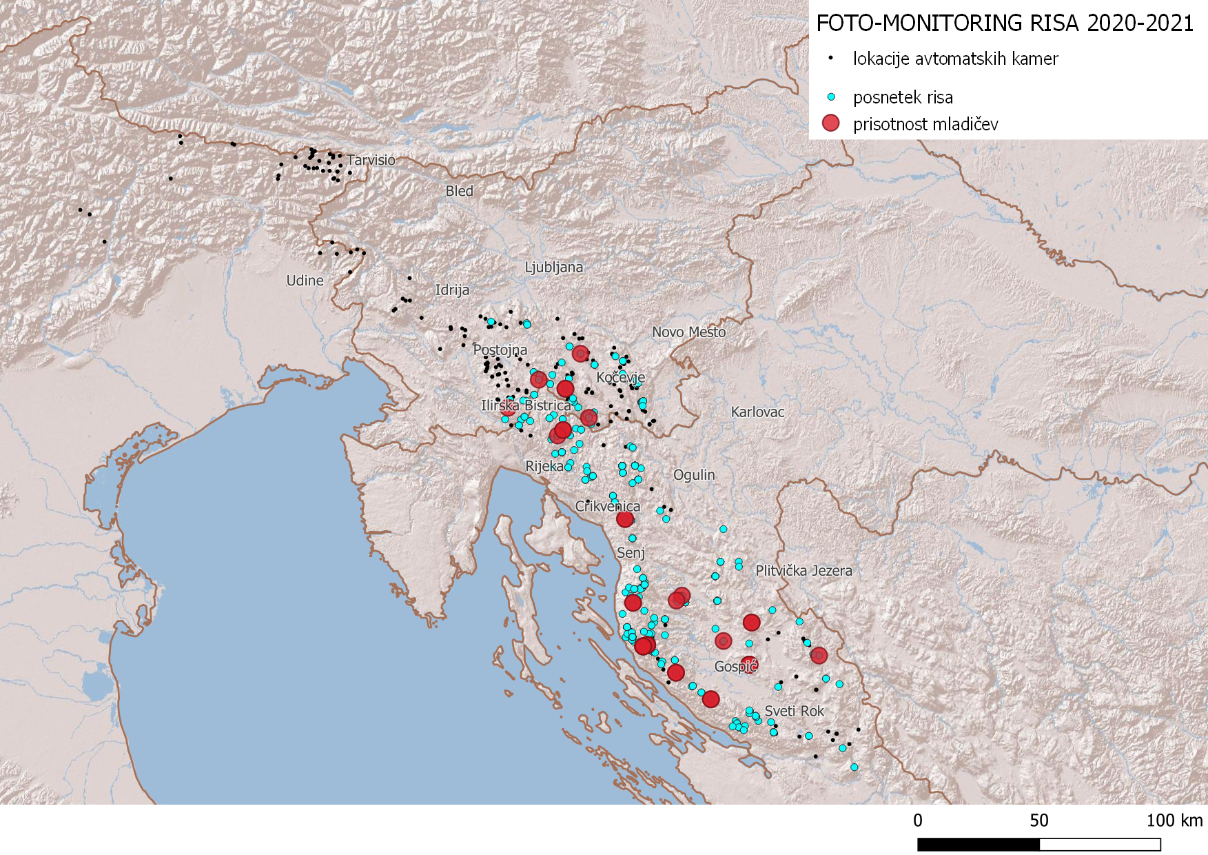 Karta područja monitoringa risa u sezoni 2020./2021., lokacije fotozamki te lokacije zabilježenih odraslih risova i mladunaca.