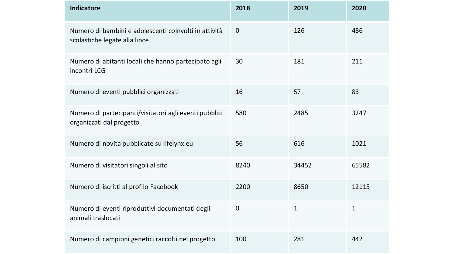 Stiamo monitorando gli indicatori per valutare gli impatti sulle funzioni ecosistemiche e l’impatto socio-economico delle azioni progettuali dall’inizio del progetto e ogni anno ((2018, 2019, 2020) prepariamo un breve rapporto su di essi. In questi rapporti mostriamo come il progetto ha coinvolto il pubblico e in particolare i gruppi target chiave (ad es. cacciatori, scuole, agricoltori, pubblico, comunità scientifica), in che modo il progetto ha avuto un impatto sui sistemi di governance, ha creato nuovi posti di lavoro o ha influenzato in altro modo il benessere delle comunità locali.